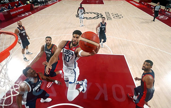 末节,前半段双方陷入苦战,法国队将分差缩小到只有6分,四节还有6分28秒,米德尔顿走步违例,美国队请求暂停。暂停回来法国队尼利基纳3分命中,法国70-73仅仅落后3分。美国队连得6分再次拉开分差,塔图姆关键3分命中,美国队82-72领先10分。最后10秒法国队一度将分差缩小到3分,美国队暂停之后杜兰特稳稳的两罚两中,法国最后一攻不进,美国87-82险胜夺金。