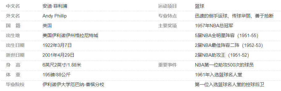 1958年,安迪·菲利浦宣布退役 。安迪·菲利浦以他迅速的倒手运球以及出神入化不可思议的传球著称,是NBA历史上第一位助攻达到500次的球员 。1961年,安迪·菲利浦入选奈·史密斯篮球名人纪念堂,他也成为第一位入选篮球名人堂的控球后卫。