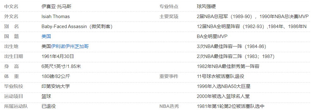 伊赛亚·托马斯(Isiah Thomas),1961年4月30日出生于美国伊利诺伊州芝加哥,前美国职业篮球运动员,司职控球后卫,绰号“微笑刺客”(Baby-Faced Assassin)。