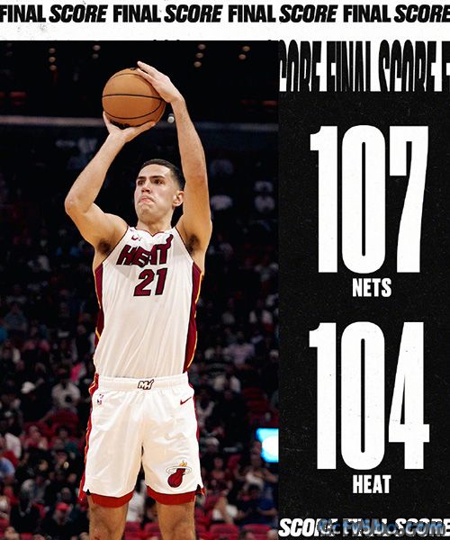 末节,朗尼-沃克、布里奇斯、阿隆-布鲁克斯连中三分,夏普补篮,篮网95-86领先9分。约维奇、斯威德三分回应,之后斯威德抛投得分,热火回敬一波10-0反超比分。朗尼-沃克突破抛投,他和夏普再中三分,最后一分钟篮网105-100领先。邓肯-罗宾逊突破上篮,德鲁-史密斯反手打进,热火最后16秒追到104-105。夏普两罚全中,斯威德投丢三分,热火惜败。