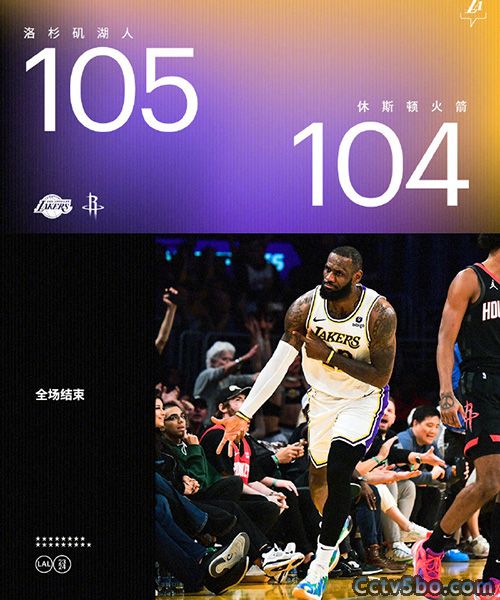 末节,申京连续得分,帮助火箭追到85-88。八村塁中投,之后戴维斯吃到进攻犯规,还剩7分钟领到个人第5次犯规。戴维斯继续留在场上并防住申京,詹姆斯战斧劈扣,湖人领先7分。史密斯补扣,狄龙三分。詹姆斯转身跳投回应。狄龙再进三分,火箭追到93-94。詹姆斯最后3分27秒干拔三分命中,湖人领先4分。范弗里特中投,接着他在最后95秒投进扳平三分,两队战至95平。詹姆斯、申京各自篮下攻进一球,最后58秒申京制造戴维斯进攻犯规,后者六犯毕业。最后23.7秒里夫斯接到詹姆斯传球命中超远三分,湖人103-100领先。申京单打八村塁得手。里夫斯两罚一中,最后10秒湖人领先2分。申京低位单挑詹姆斯打进扳平。詹姆斯突破到篮下造成犯规,他两罚一中,湖人105-104领先,留给火箭1.9秒。火箭没有暂停,狄龙三分不中,火箭惜败。