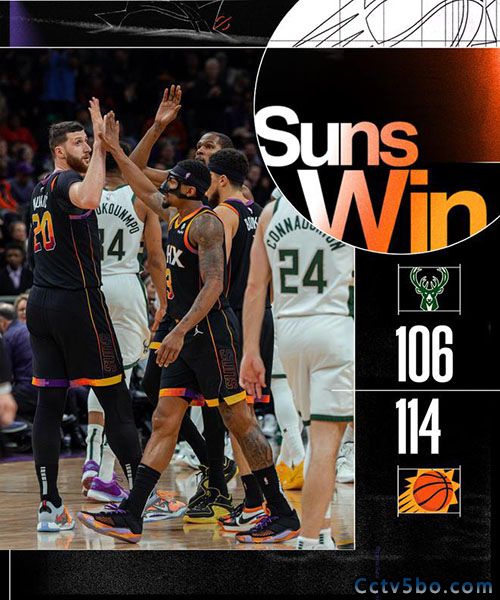 5播体育网 北京时间2月7日,NBA常规赛继续进行,太阳队(30胜21负)拿到连胜。布克得到32分,杜兰特和比尔均得分20+,他们率队第三节拉开比分后守住领先,太阳队在主场以114-106战胜雄鹿队(33胜18负)。太阳队拿到2连胜,雄鹿队遭遇2连败。