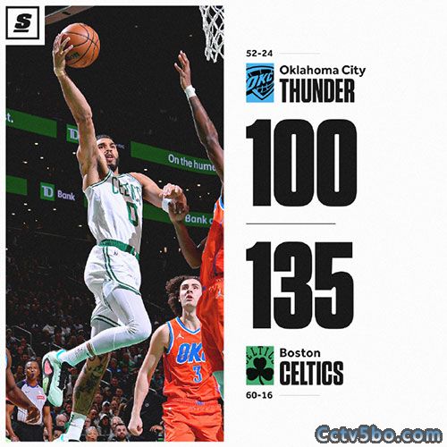 5播体育网 北京时间4月4日,NBA东西部强强对决,凯尔特人主场对阵雷霆,其中雷霆是背靠背第二场,亚历山大继续伤停。凯尔特人轻松碾压雷霆,最终凯尔特人135-100战胜雷霆收获3连胜,成为本赛季首支达成60胜球队,同时正式锁定联盟第一常规赛冠军,也是队史时隔15年再次单季60+胜,将去冲击队史第18冠。