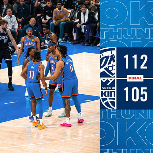 末节,雷霆直接一波5-0完成反超,随后两队展开拉锯差,关键时刻亚历山大高难度中投命中、突破造杀伤帮助雷霆在最后35秒领先5分,随后国王暂停回来直接失误,亚历山大两罚稳稳命中杀死比赛。最终雷霆112-105战胜国王。