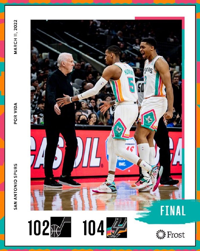 5播体育讯:北京时间3月12日,NBA常规赛继续进行,马刺主场迎战爵士,此役爵士后卫博扬-博格丹诺维奇缺席,马刺方面麦克德莫特和新秀普里莫无法出战。最终,马刺第四节完成逆转,以104-102击败爵士。波波维奇拿下执教生涯第1336场胜利,成为历史最多胜场教练。
