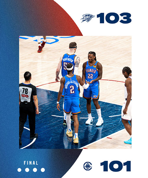 雷霆(59-12):亚历山大26分3板8助2断、维金斯19分3板1助、哈尔滕施泰因14分10板6助2断3帽、卡鲁索14分6板5助2断、杰林威12分7板2助、多特10分4板2助、华莱士8分4板2助2断、肯威3板2助、乔2板