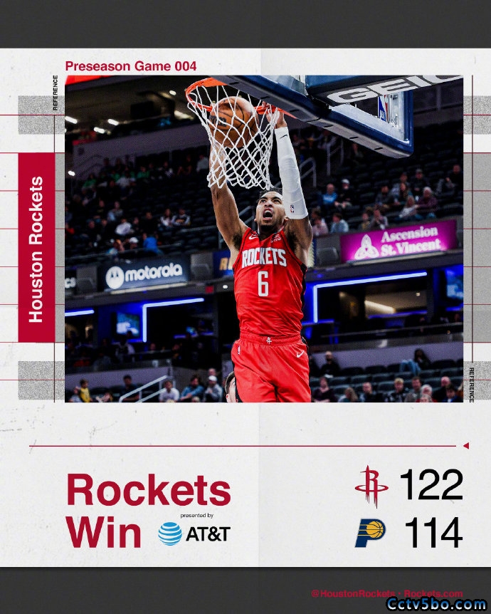 5播体育网:北京时间2022年10月15日,NBA季前赛来到收官日。休斯顿火箭122-117击败印第安纳步行者。