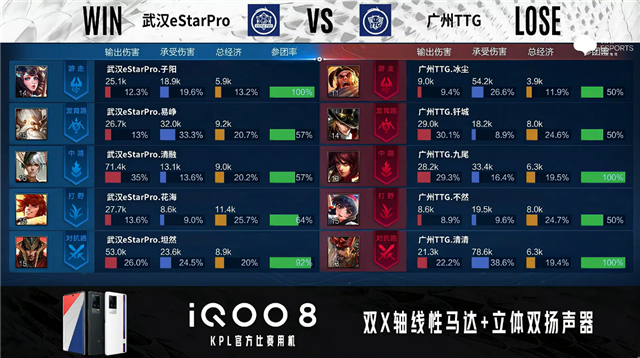 双方常规开局。1分33秒武汉eStar主宰处击杀周瑜拿到一血。1分22秒广州TTG对抗路击杀廉颇。3分33秒武汉eStar野区打出0换2。3分44秒武汉eStar拿下暴君。5分18秒武汉eStar拿下主宰。5分28秒武汉eStar野区击杀周瑜。5分43秒武汉eStar越塔击杀苏烈并摧毁敌方中路外塔。6分46秒发育路团战武汉eStar打出2换4。7分16秒武汉eStar摧毁敌方发育路高地塔。9分10秒武汉eStar摧毁敌方对抗路二塔。9分29秒武汉eStar摧毁敌方中路二塔。9分50秒武汉eStar拿下主宰。10分26秒武汉eStar拿下暗影暴君。12分09秒武汉eStar拿下暗影主宰。13分15秒对抗路团战武汉eStar打出0换4。13分36秒武汉eStar摧毁敌方水晶拿下比赛。