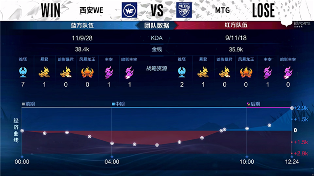 1分52秒,MTG太乙真人下路击杀李元芳拿下一血。3分12秒,MTG控下暴君,随后西安WE控下先知主宰。4分04秒,下路团战双方射手互换。6分55秒,西安WE破掉MTG下一塔,随后团战双方2换2。7分26秒,西安WE中路击杀西施。6分钟,西安WE控下暴君,随后MTG控下先知主宰。9分21秒,双方团,MTG打出1换2,随后破掉西安WE中二塔。10分35秒,MTG控下暗影主宰,西安WE李元芳抢到暗影暴君,随后团战MTG打出1换4。12分12秒,MTG破掉西安WE上二塔。13分钟,MTG破掉西安WE下二塔。13分18秒,MTG中路击杀阿古朵。13分40秒,MTG中路打出0换2后破掉西安WE中高地。14分钟,MTG中路一波摧毁西安WE水晶扳回一城。
