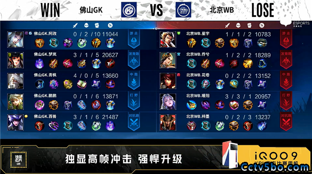 双方常规开局。2分22秒佛山GK对抗路击杀蒙恬拿到一血。2分48秒佛山GK野区击杀周瑜。3分35秒北京WB发育路打出0换2。4分32秒佛山GK摧毁敌方发育路外塔。4分38秒佛山GK拿下主宰。8分48秒北京WB摧毁敌方中路外塔。8分59秒北京WB拿下主宰。10分42秒北京WB拿下暗影暴君。11分10秒北京WB暴君处击杀东皇太一。12分10秒北京WB拿下暗影主宰。12分39秒佛山GK中路击杀露娜。16分47秒北京WB拿下暗影主宰。18分12秒北京WB击杀阿古朵并摧毁发育路高地塔。19分12秒北京WB拿下暗影暴君。20分24秒北京WB主宰处击杀马超。20分57秒北京WB拿下风暴龙王。22分14秒北京WB摧毁敌方对抗路高地塔。22分41秒高地团战佛山GK打出0换5。23分41秒佛山GK摧毁敌方中路、对抗路高地塔。26分37秒佛山GK拿下风暴龙王。27分49秒佛山GK摧毁敌方发育路高地塔。28分13秒佛山GK摧毁敌方水晶拿下比赛。