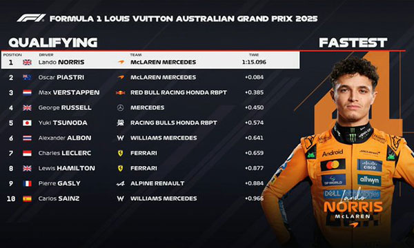 5播体育网 北京时间3月15日,2025赛季F1揭幕战澳大利亚大奖赛排位赛在阿尔伯特公园赛道展开争夺。迈凯伦车手诺里斯1分14秒415拿下杆位,队友皮亚斯特里第二,红牛车队的维斯塔潘第三,汉密尔顿仅名列第八位。