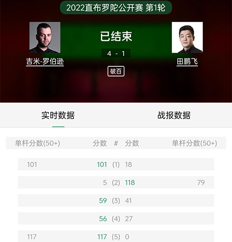 第5局,罗伯逊率先上手轰出单杆117分一杆制胜,最终全场比赛结束,吉米罗伯逊4-1大胜田鹏飞,顺利晋级。