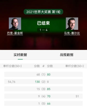 第4局,塞尔比56-0领先,霍金斯单杆9分,打黑球K红球,结果黑球没进,红球K出机会,塞尔比上手单杆14分以70-9拿下。塞尔比3-1赛点。