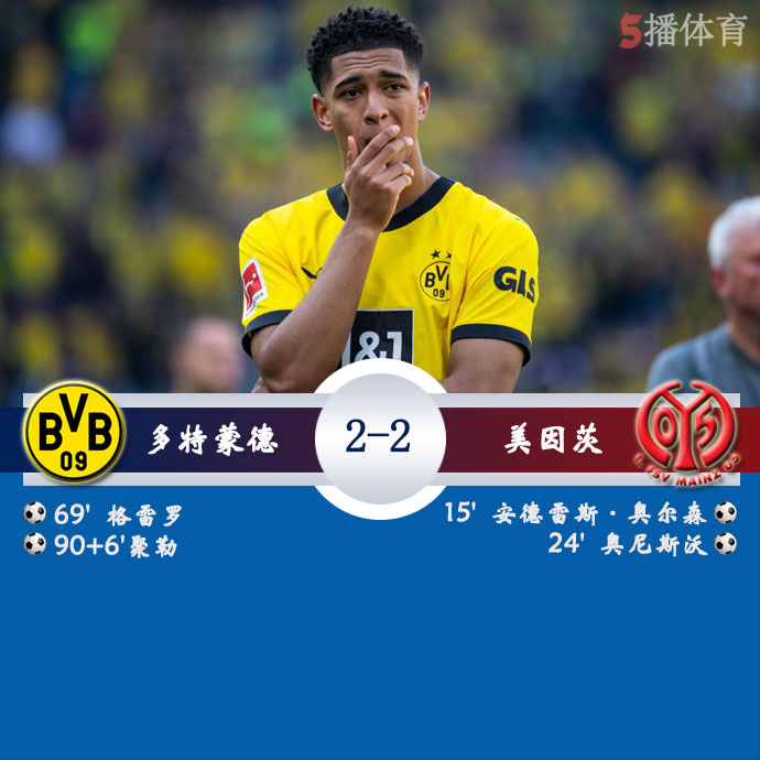 5播体育网 北京时间5月27日21:30,德甲最后一轮争冠战,多特蒙德坐镇主场西格纳-伊杜纳公园球场迎战美因茨,本场主裁判为马尔科-弗里茨。上半场,汉切-奥尔森首开记录,随后格雷罗造点,阿莱主罚点球被扑,奥尼西沃头槌再下一城,阿德耶米伤退。下半场,格雷罗为多特扳回一城,聚勒读秒扳平比分。最终,多特主场连扳两城2-2战平美因茨。