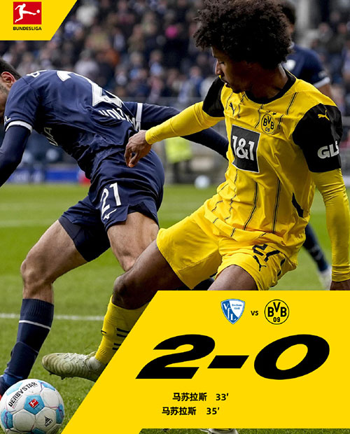 第35分钟,两分钟连丢两球!聚勒回传失误,马苏拉斯单刀破门,多特客场0-2落后波鸿。