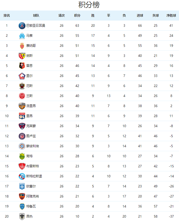 法甲联赛最新积分榜及下一轮赛程详情一览