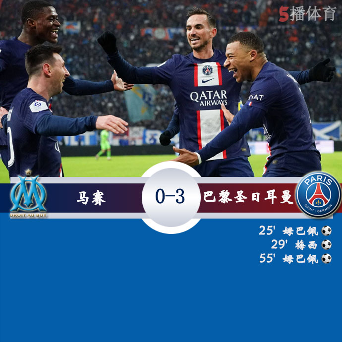 5播体育网 北京时间2月27日03:45,法甲第25轮迎来法国国家德比,巴黎圣日耳曼作客韦洛德罗姆球场挑战马赛,本场主裁判为蒂尔潘。上半场,梅西与姆巴佩互送传射,前者达成俱乐部生涯700球里程碑;金彭贝无对抗伤退。下半场,梅西销魂挑传助攻姆巴佩再入一球完成双响,打入巴黎生涯第200球,追平卡瓦尼,并列队史射手王;多纳鲁马屡献精彩扑救。最终,巴黎客场3-0完胜马赛,将积分榜领跑优势扩大至8分。