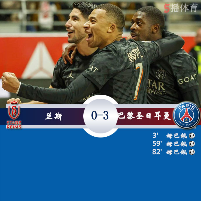5播体育网 北京时间11月12日法甲联赛第12轮,兰斯主场对阵巴黎圣日耳曼。开场三分钟,登贝莱传中,姆巴佩凌空破。下半场,索莱尔助攻,姆巴佩门前轻松推射破门。比赛临近尾声,巴尔科拉助攻,姆巴佩推射破门完成帽子戏法,多纳鲁马奉献多次神扑。最终比分0-3。