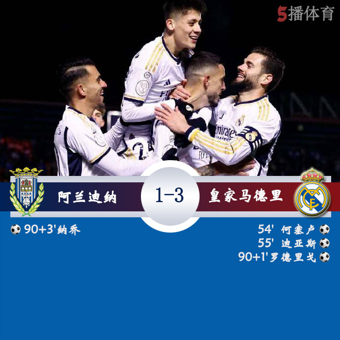 5播体育网 北京时间1月7日04:30,国王杯第三轮继续进行,皇家马德里作客对阵西协乙(第四级别联赛)球队阿兰迪纳。上半场,居莱尔首秀任意球中柱+屡造威胁。下半场,卜拉欣-迪亚斯传射+造点,何塞卢点射,罗德里戈替补建功,纳乔自摆乌龙。最终,皇马客场3-1击败阿兰迪纳,晋级国王杯16强。