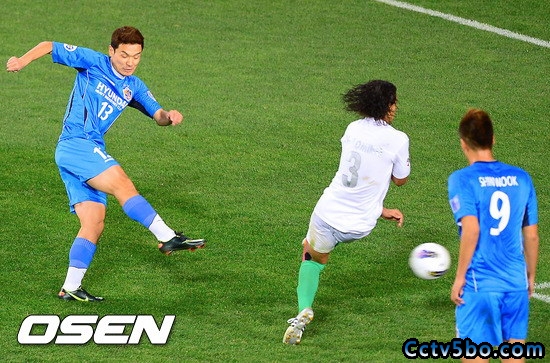 亚冠决赛采取单场定胜负,根据赛前抽签,蔚山现代幸运获得主场优势。开场之后蔚山现代借助主场之利主动出击,接连打出威胁攻势。强攻之下的蔚山现代队在第13分钟打破僵局——当时蔚山现代获得前场左侧任意球,金成龙主罚任意球开到后点,队长郭泰辉力压对方后卫强势冲顶,皮球钻入球门近角,1-0!领先之后的蔚山现代打得更加从容,第21分钟,蔚山现代后场抢断迅速反击大范围转移到左路,李根镐得球后连续晃动准备突破时被断下。第25分钟,蔚山现代哥伦比亚外援贝莱斯禁区外围重炮轰门,皮球直接飞出。