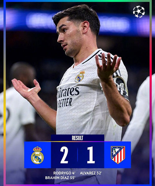 5播体育网北京时间3月5日04:00,欧冠1/8决赛首回合,皇家马德里坐镇主场伯纳乌球场迎战马德里竞技,本场主裁判为蒂尔潘。上半场,罗德里戈内切兜射破门,朱利亚诺-西蒙尼禁区内抽射打偏,维尼修斯远射被门将没收,阿尔瓦雷斯世界波破门扳平比分。下半场,姆巴佩远射被门将没收,卜拉欣-迪亚斯低射破门,希门尼斯抽射打高,最终,皇马2-1战胜马竞。