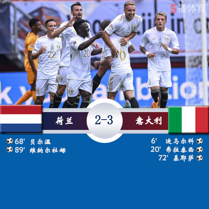 5播体育网 北京时间6月18日晚间21:00,欧国联季军赛,荷兰对阵意大利,本场比赛主裁判为尼伯格-格伦。上半场,邓弗里斯头球造险,迪马尔科抽射首开纪录,弗拉泰西扩大比分,加克波错失良机。下半场,加克波开场再失良机,迪马尔科做出关键封堵,贝尔温替补扳回一城,基耶萨破门,韦格霍斯特破门被吹,威纳尔杜姆再扳一球。最终,荷兰2-3意大利。