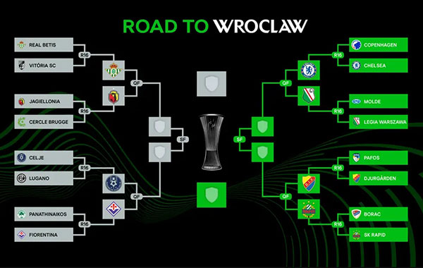5播体育网 北京时间3月14日,欧联1/8决赛第二回合战罢,8强出炉,1/4决赛对阵如下: