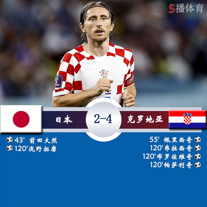 5播体育网 北京时间12月5日晚23:00,2022卡塔尔世界杯八分之一决赛迎来焦点大战,日本对阵克罗地亚的比赛将在贾努布球场打响!上半场,富安健洋后场失误,佩特科维奇错失单刀机会,半场结束前前田大然破门,最终上半场比赛结束,日本1-0领先克罗地亚;下半场,佩里西奇头球扳平比分,常规90分钟后战罢,日本1-1克罗地亚,双方进入加时。加时赛双方均无建树,比赛最终进入点球大战。最终日本点球大战1-3,总比分2-4不敌克罗地亚惨遭淘汰。克罗地亚进入世界杯八强。