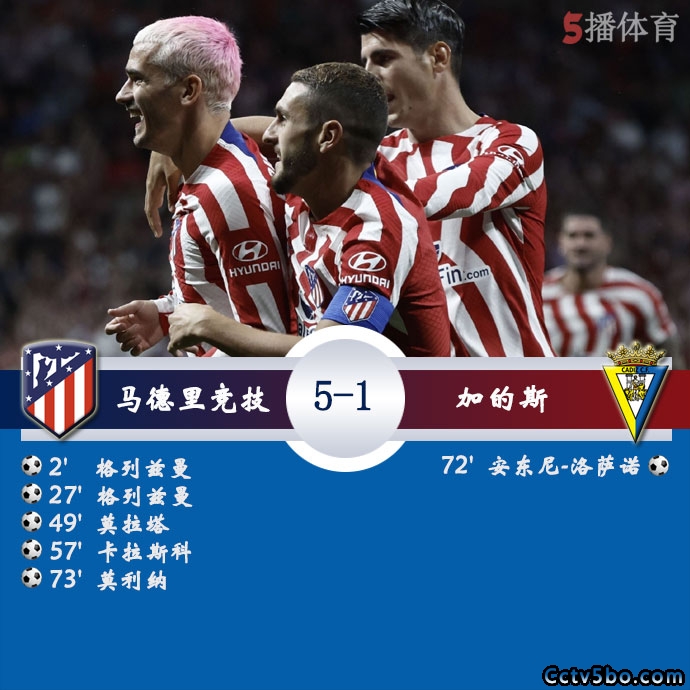 5播体育网 北京时间5月4日04:00,西甲第33轮继续进行,马德里竞技坐镇主场西维塔斯大都会球场迎战加的斯,本场主裁判为塞萨尔-索托。上半场,格列兹曼先后接卡拉斯科和勒马尔的助攻破门上演梅开二度。下半场,莫拉塔、卡拉斯科与莫利纳分别建功,安东尼-洛萨诺世界波扳回一城。最终,马竞多点开花主场5-1大胜加的斯,升至积分榜第二位。