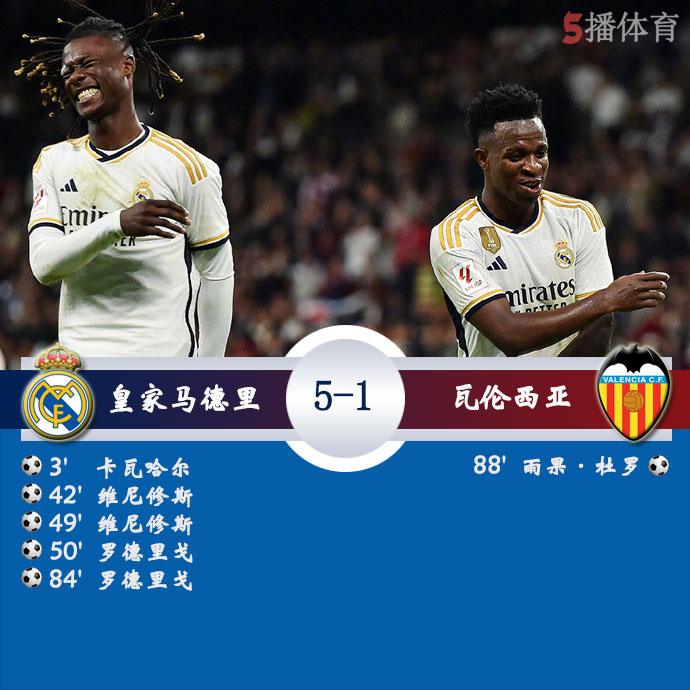 5播体育网 北京时间11月12日凌晨4:00,2023-2024赛季西甲第13轮的一场大战打响,西甲豪门皇马在主场对战瓦伦西亚。上半场比赛,卡瓦哈尔世界波得分,维尼修斯进球。下半场比赛,维尼修斯建功,罗德里戈梅开二度,杜罗为瓦伦西亚打入挽回颜面的一球。全场比赛结束,皇马在主场5-1大胜。