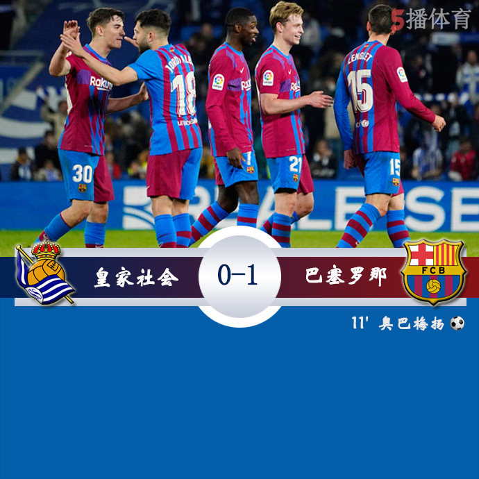 5播体育网 北京时间2022年4月22日03:30,2021/2022赛季西甲第33轮展开角逐,皇家社会坐镇主场迎战巴塞罗那。上半场,巴塞罗那率先得分,凭借奥巴梅扬的进球,1:0领先。下半场,双方都破门乏术。最终,巴塞罗那1:0获胜。
