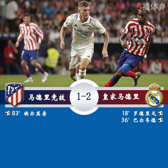 5播体育网 北京时间2022年9月19日03:00,2022/2023赛季西甲第6轮展开了一场强强对话,马德里竞技坐镇主场迎战皇家马德里。上半场,皇家马德里率先发难,凭借罗德里戈和巴尔维德的进球,2:0领先。下半场,马德里竞技凭借埃莫萨的进球缩小分差。最终,皇家马德里2:1获胜。
