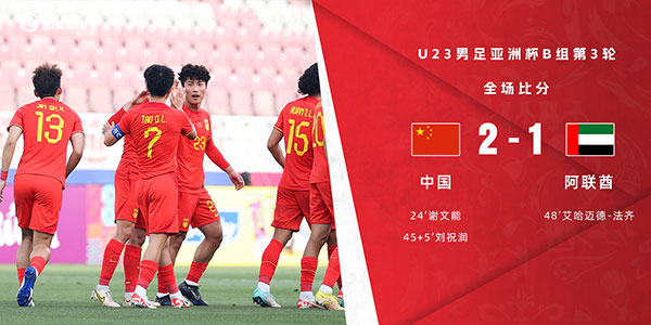 U23亚洲杯-国奥2-1阿联酋时隔6年再取胜 谢文能刘祝润破门