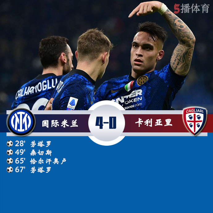 5播体育讯:北京时间2021年12月13日03:45,2021/2022赛季意甲第17轮进行了一场较量,国际米兰主场迎战卡利亚里。上半场,国际米兰率先得分,凭借劳塔罗-马丁内斯的进球,1:0领先。下半场,国际米兰凭借A-桑切斯,恰尔汉奥卢和劳塔罗-马丁内斯的进球扩大优势。最终,国际米兰4:0获胜。