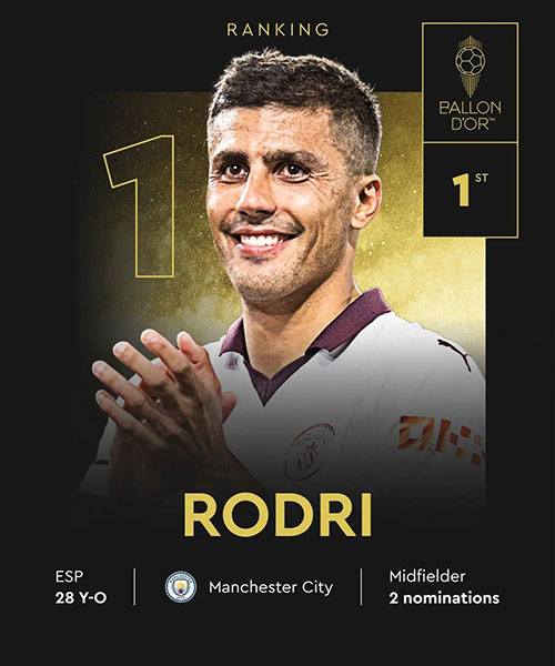 前三人今年均获得两项重要荣誉,罗德里是欧洲杯+英超,贝林厄姆和维尼修斯是欧冠+西甲。且三人都有重要最佳球员奖项入账,罗德里是欧洲杯最佳球员,维尼修斯和贝林厄姆分别是欧冠和西甲最佳球员。