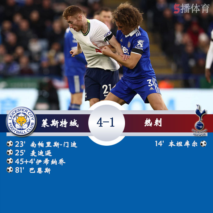 全场结束,莱斯特城4比1轻松击败热刺。