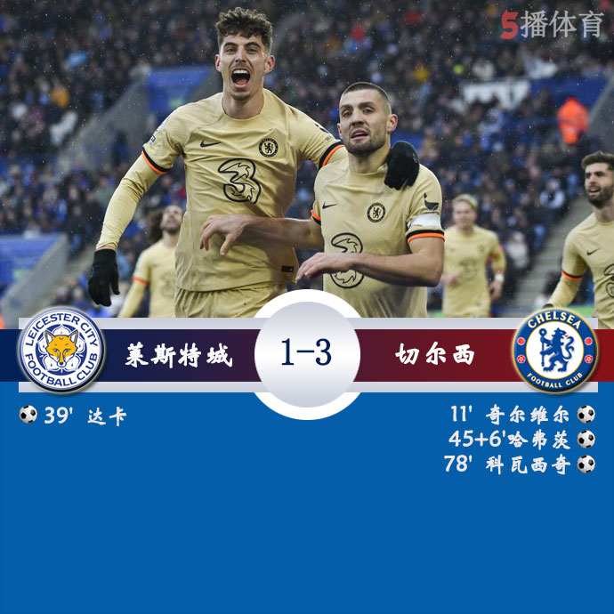 第78分钟,哈弗茨右路传向后点,穆德里克头球顶向中路,科瓦契奇凌空弹射破门!切尔西3-1莱斯特城!