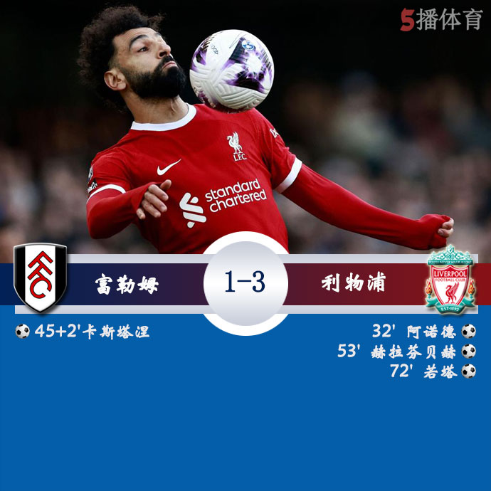 5播体育网 北京时间4月21日23:30,英超联赛第34轮,利物浦客场挑战富勒姆。上半场阿诺德任意球直接破门,卡斯塔涅补时阶段的补射破门帮助富勒姆扳平比分;下半场赫拉芬贝赫精彩远射破门帮助红军再度领先,若塔低射破门锁定胜局。最终利物浦3-1客胜富勒姆暂时升至次席。