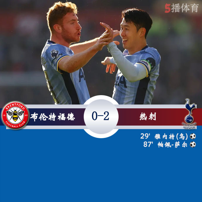 第29分钟,孙兴慜角球造雅内尔特乌龙,热刺客场1-0布伦特福德。